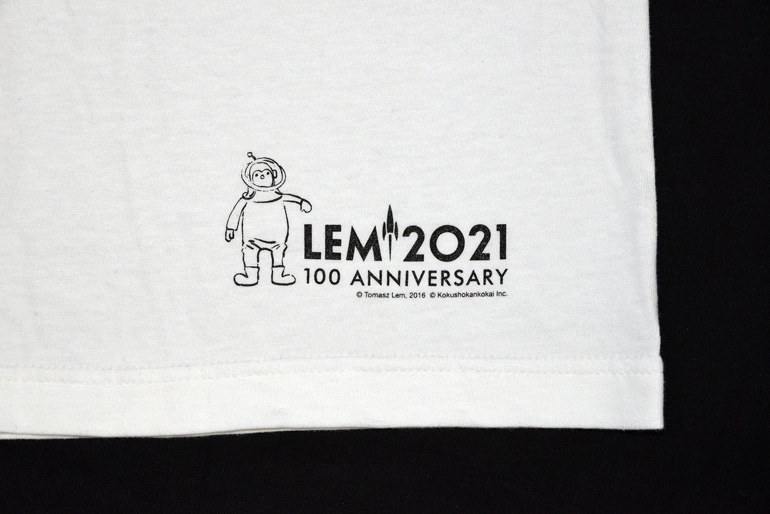 裏面の裾には100周年の記念ロゴ+イラストをプリント、かわいい宇宙飛行士はレムの肖像写真に映り込んだ人形からデザイン。